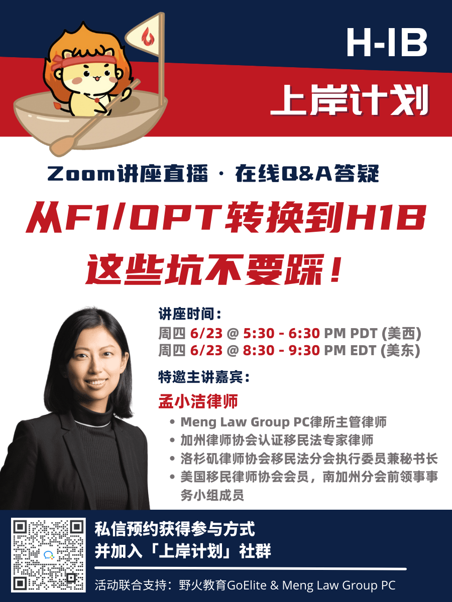 野火教育联合Meng Law Group PC律所的主管律师孟小洁律师本周就会就这个主题进行一场专场讲座!大家千万不要错过!