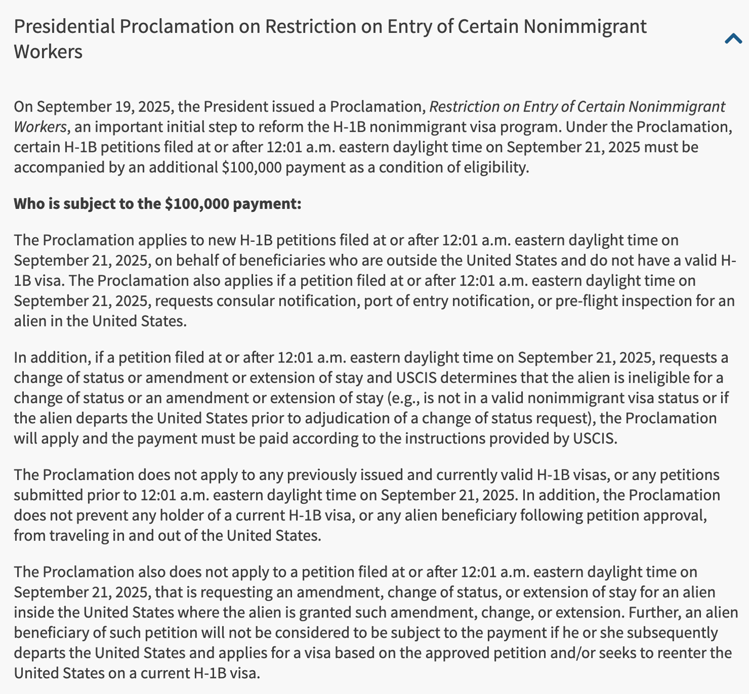 1)在 2025 年 9 月 21 日 凌晨 12:01 (美东)之后提交H1B新申请