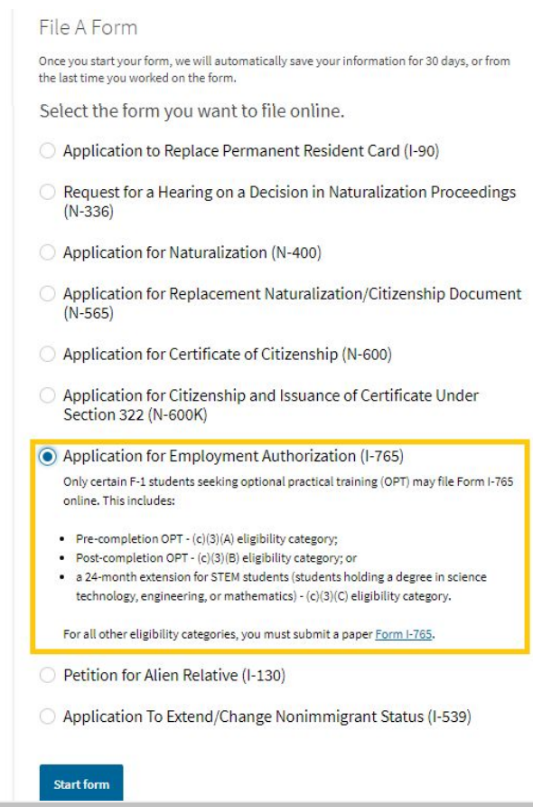 点击”Application for Employment Authorization (I-765),点击”Start form”。按上文要求在线填写表格。