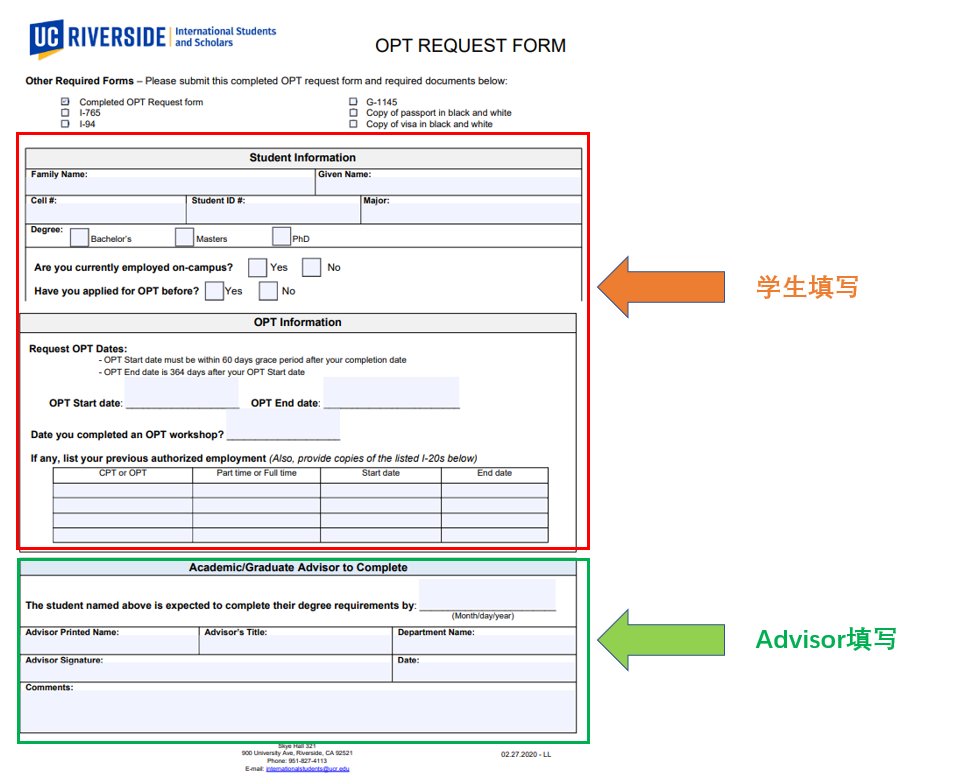 需要填写学校的OPT申请表(OPT Request form),让Advisor签字。此处以UCR的OPT申请表为例。