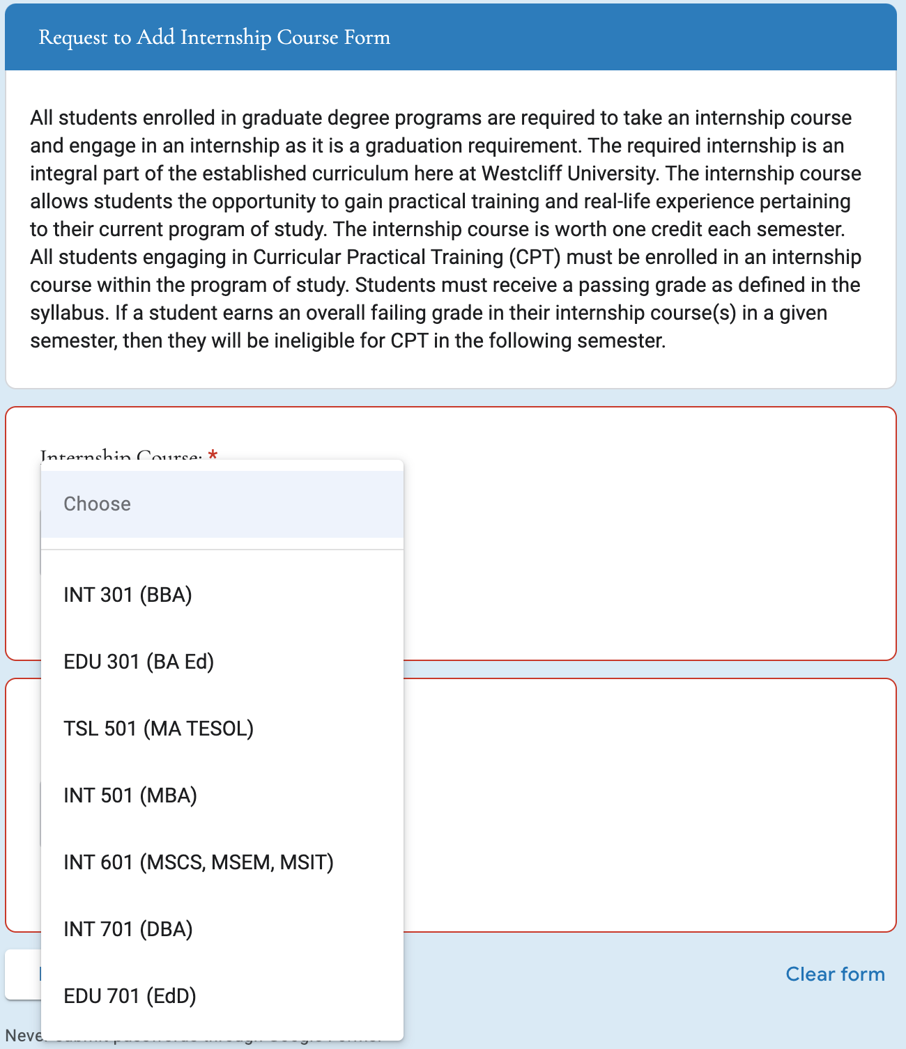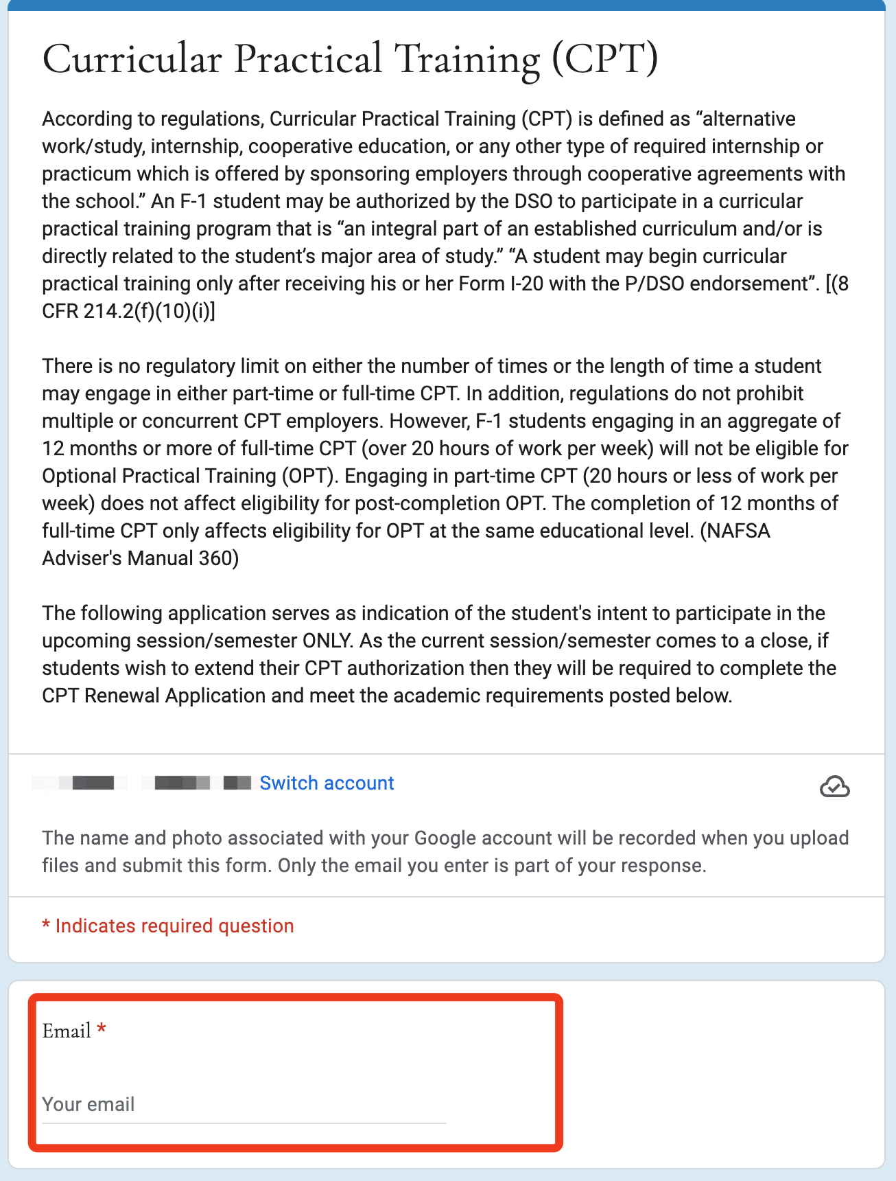 如果是学期中途需要更换雇主,确定下一学期即将到来的开始工作日期与新雇主提交“Change Curricular Practical Training (CPT) Request Form”。更改CPT申请表必须在更改前至少提前五个工作日提交。